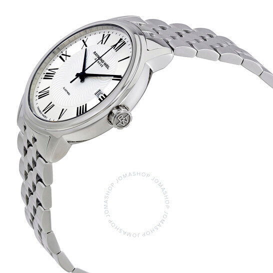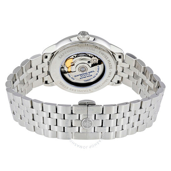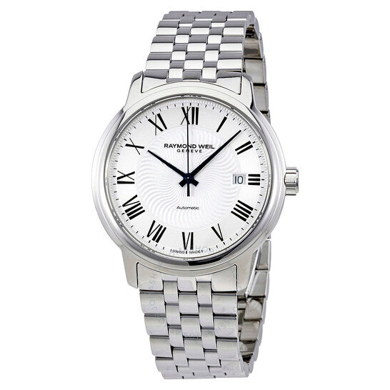 علبة فضية اللون من الفولاذ المقاوم للصدأ مع سوار فضي اللون من الفولاذ المقاوم للصدأ. إطار ثابت فضي اللون من الفولاذ المقاوم للصدأ. ميناء فضي بعقارب زرقاء وعلامات ساعات رومانية. علامات دقائق حول الحافة الخارجية. نوع الميناء: تناظري. عرض التاريخ عند موضع الساعة 3. حركة أوتوماتيكية من ريموند ويل كاليبر RW 4200، مبنية على سيليتا SW-200، تحتوي على 25 جوهرة، تنبض بمعدل 28800 ذبذبة في الساعة، ولديها احتياطي طاقة لمدة 38 ساعة تقريبًا. زجاج من الياقوت المقاوم للخدش. تاج قابل للسحب/الدفع. غطاء خلفي شفاف. شكل العلبة دائري، حجم العلبة: 40 مم، سمك العلبة: 10 مم. عرض السوار: 20 مم. قابلة للطي بمشبك أمان. مقاومة للماء حتى عمق 50 مترًا / 165 قدمًا. الوظائف: التاريخ، الساعة، الدقيقة، الثانية. معلومات إضافية: مناسبة بشكل عام لفترات السباحة الترفيهية القصيرة، ولكنها ليست مناسبة للغوص أو الغطس السطحي. سلسلة مايسترو. طراز ساعة رسمية. علامة الساعة: صناعة سويسرية. ساعة ريموند ويل مايسترو أوتوماتيكية للرجال بمينا فضية 2237-ST-00659.