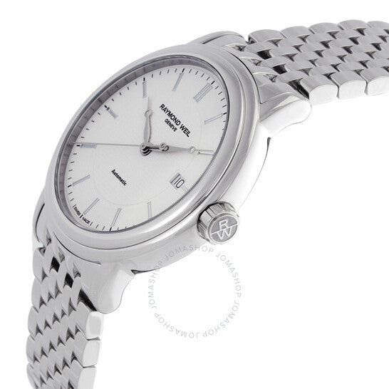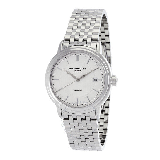 علبة وسوار من الفولاذ المقاوم للصدأ فضي اللون. إطار ثابت من الفولاذ المقاوم للصدأ فضي اللون. ميناء أبيض بعقارب وعلامات ساعات فضية اللون. علامات دقائق حول الحافة الخارجية. نوع الميناء: تناظري. عرض التاريخ عند موضع الساعة 3. حركة أوتوماتيكية من ريموند ويل كاليبر RW 4200، مبنية على سيليتا SW-200، تحتوي على 25 جوهرة، تنبض بمعدل 28800 ذبذبة في الساعة، ولديها احتياطي طاقة يدوم حوالي 38 ساعة. زجاج ياقوتي مقاوم للخدش. تاج قابل للسحب/الدفع. غطاء خلفي شفاف. شكل العلبة دائري، مقاسها: 39.5 مم، سمكها: 9.2 مم. عرض السوار: 19 مم. مشبك قابل للطي مع مفتاح أمان. مقاومة للماء حتى عمق 50 مترًا / 165 قدمًا. الوظائف: التاريخ، الساعة، الدقائق، الثواني. سلسلة مايسترو. تصميم ساعة كاجوال. علامة الساعة: صناعة سويسرية. ساعة ريموند ويل مايسترو أوتوماتيكية للرجال بمينا أبيض 2837-ST-30001.