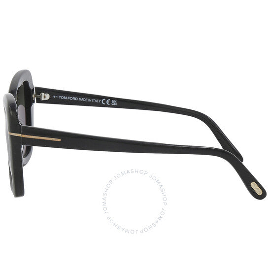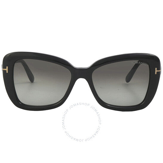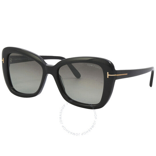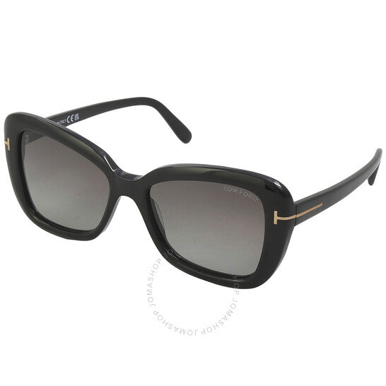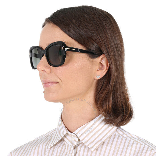 نظارات شمسية من توم فورد. سلسلة مايف. رقم السلسلة: FT1008. رمز اللون: 01B. الشكل: فراشة. عرض العدسة: 55 مم. جسر العدسة: 17 مم. طول الذراع: 140 مم. حماية 100% من الأشعة فوق البنفسجية. مادة الإطار: بلاستيك. لون الإطار: أسود لامع. نوع العدسات: دخاني متدرج. نمط الحافة: حافة كاملة. رمز UPC/EAN: 889214385161. نظارات شمسية نسائية من توم فورد مايف دخاني متدرج بتصميم فراشة، FT1008 01B 55.