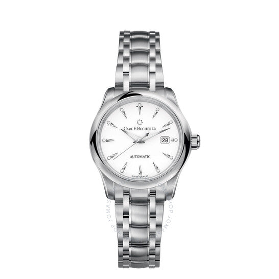 علبة فضية اللون من الفولاذ المقاوم للصدأ مع سوار فضي اللون. إطار ثابت فضي اللون من الفولاذ المقاوم للصدأ. ميناء أبيض مع عقارب فضية اللون على شكل دوفين وعلامات ساعات. نوع الميناء: تناظري. عقارب وعلامات مضيئة. عرض التاريخ عند موضع الساعة 3. حركة أوتوماتيكية كارل إف. بوخرر كاليبر CFB 1963 مع احتياطي طاقة 38 ساعة. زجاج ياقوت مقاوم للخدش. تاج قابل للسحب/الدفع. هيكل دائري الشكل، مقاسه 30 مم. مقاومة للماء حتى عمق 30 مترًا / 100 قدم. الوظائف: التاريخ، الساعة، الدقيقة، الثانية. سلسلة مانيرو. تصميم ساعة فاخرة. علامة الساعة: صناعة سويسرية. رقم الصنف: 366.585.6. ساعة كارل إف. بوخرر مانيرو أوتوماتيكية نسائية 00.10911.08.23.21.