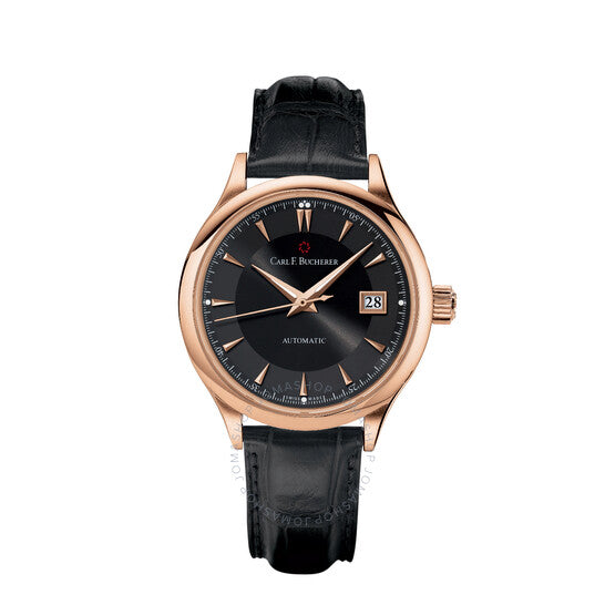 علبة من الذهب الوردي عيار 18 قيراطًا مع سوار أسود من جلد التمساح. إطار ثابت. ميناء أسود بعقارب وعلامات ساعات ذهبية وردية اللون. علامات دقائق حول الحافة الخارجية. نوع الميناء: تناظري. عرض التاريخ عند موضع الساعة 3. حركة أوتوماتيكية كارل إف. بوخرر كاليبر CFB 1965 مع احتياطي طاقة يدوم حوالي 42 ساعة. زجاج ياقوتي مقاوم للخدش. حجم العلبة: 38 مم. سُمكها: 8.75 مم. شكلها دائري. مقاومة للماء حتى عمق 30 مترًا / 100 قدم. الوظائف: التاريخ، الساعة، الدقيقة، الثانية. تصميم ساعة فاخرة. علامة الساعة: صناعة سويسرية. رقم المنتج: 169.009.5. ساعة كارل إف. بوخرر مانيرو أوتوماتيكية للرجال، 00.10908.03.33.01.