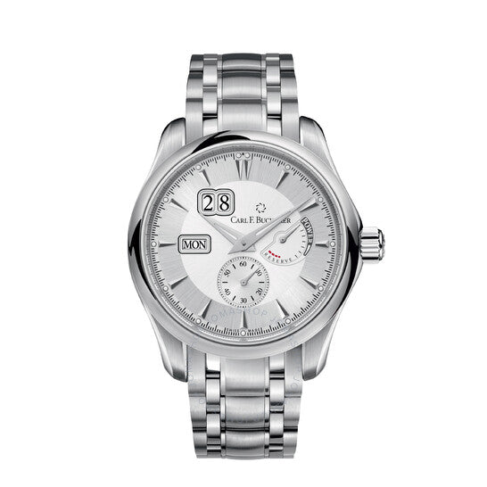 علبة فضية اللون من الفولاذ المقاوم للصدأ مع سوار فضي اللون من الفولاذ المقاوم للصدأ. إطار ثابت فضي اللون من الفولاذ المقاوم للصدأ. ميناء فضي اللون مع عقارب وعلامات ساعات فضية اللون. علامات دقائق حول الحافة الخارجية. نوع الميناء: تناظري. عرض التاريخ عند موضع الساعة التاسعة. ميناءان فرعيان لاحتياطي الطاقة - 60 ثانية. حركة أوتوماتيكية من كارل إف. بوخرر كاليبر CFB A1011، تحتوي على 33 جوهرة، تنبض بتردد 21600 ذبذبة في الساعة، ولديها احتياطي طاقة لمدة 55 ساعة تقريبًا. كريستال ياقوت مقاوم للخدش. تاج قابل للسحب/الدفع. غطاء خلفي شفاف هيكلي. شكل دائري، حجم العلبة: 42.5 مم، سمك العلبة: 12.54 مم. مقاومة للماء حتى عمق 30 مترًا / 100 قدم. الوظائف: تاريخ كبير، يوم، ساعة، دقيقة، ثانية صغيرة، مؤشر احتياطي الطاقة. سلسلة مانرو. تصميم ساعة فاخرة. علامة الساعة: صناعة سويسرية. اختلافات المنتج: 166.280.6. ساعة كارل اف بوخرير مانرو الأوتوماتيكية للرجال 00.10912.08.13.21.