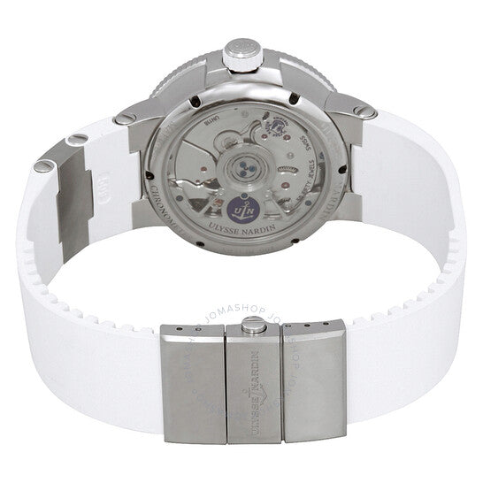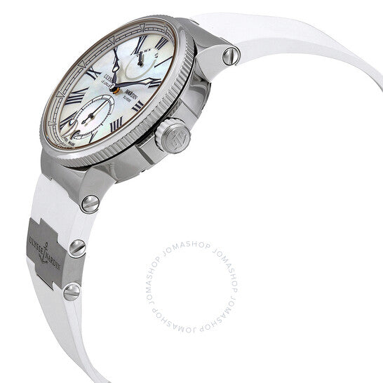 علبة فضية اللون من الفولاذ المقاوم للصدأ مع سوار مطاطي أبيض بعناصر من التيتانيوم. إطار ثابت فضي اللون من الفولاذ المقاوم للصدأ. ميناء من عرق اللؤلؤ مع عقارب سوداء وعلامات ساعات رومانية. علامات دقائق حول الحافة الخارجية. نوع الميناء: تناظري. عقارب مضيئة. عرض التاريخ عند موضع الساعة السادسة. حركة أوتوماتيكية من أوليس ناردين كاليبر UN-118 مع احتياطي طاقة لمدة 60 ساعة. زجاج من الياقوت المقاوم للخدش. تاج لولبي. غطاء خلفي شفاف. شكل العلبة دائري، مقاس العلبة: 39 مم، سمكها: 13.85 مم. عرض السوار: 22 مم. مشبك قابل للطي بزر ضغط. مقاومة للماء حتى عمق 30 مترًا / 100 قدم. الوظائف: التاريخ، الساعة، الدقيقة، الثانية، مؤشر احتياطي الطاقة، الكرونومتر. طراز ساعة فاخرة. ملصق الساعة: صناعة سويسرية. ساعة أوليس ناردين مارين كرونومتر أوتوماتيكية نسائية 1183-160-3/40.