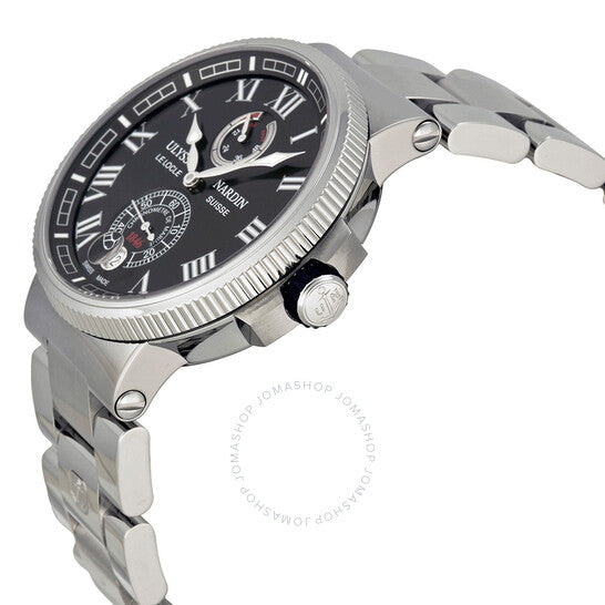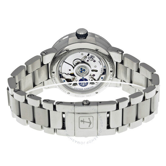 علبة فضية اللون من الفولاذ المقاوم للصدأ مع سوار فضي اللون من الفولاذ المقاوم للصدأ. إطار ثابت فضي اللون من الفولاذ المقاوم للصدأ. ميناء أسود مع عقارب فضية اللون مضيئة على شكل مجرفة وعلامات ساعات عربية. علامات دقائق حول الحافة الخارجية. نوع الميناء: تناظري. عقارب وعلامات مضيئة. عرض التاريخ عند موضع الساعة 6. ميناءان فرعيان - 60 ثانية واحتياطي الطاقة. حركة أوليس ناردين كاليبر UN-118 أوتوماتيكية، مبنية على أوليس ناردين UN-66، تحتوي على 50 جوهرة، تنبض بمعدل 28800 ذبذبة في الساعة، ولديها احتياطي طاقة لمدة 60 ساعة تقريبًا. كريستال ياقوت مقاوم للخدش. تاج لولبي. غطاء خلفي شفاف. شكل دائري، حجم العلبة: 43 مم، سمك العلبة: 13.85 مم. عرض السوار: 20.3 مم، طول السوار: 8 بوصات. قابلة للطي بمشبك بزر ضغط للفتح. مقاومة للماء حتى عمق 100 متر / 330 قدمًا. الوظائف: التاريخ، الساعة، الدقيقة، الثانية، مؤشر احتياطي الطاقة، الكرونومتر. طراز ساعة رسمية. علامة الساعة: صناعة سويسرية. ساعة أوليس ناردين مارين كرونومتر للرجال بمينا أسود، 1183-126-7M-42.