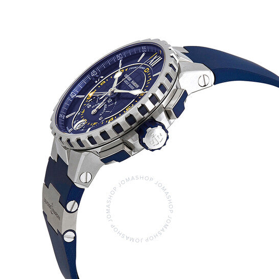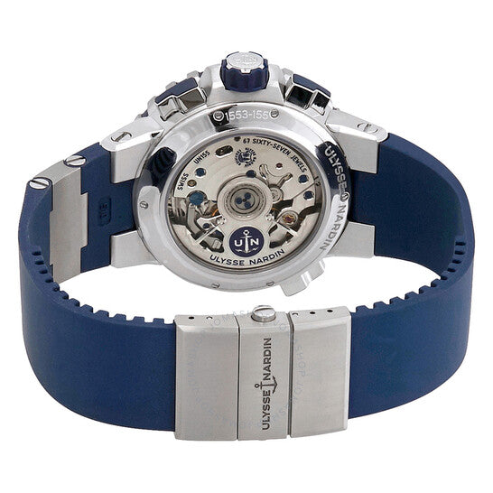 علبة فضية اللون من الفولاذ المقاوم للصدأ، مع سوار أزرق من السيليكون مُدمج بعناصر من التيتانيوم. إطار دوار أحادي الاتجاه من الفولاذ المقاوم للصدأ فضي اللون. ميناء أزرق مع عقارب ومؤشرات ساعات فضية مضيئة. أرقام رومانية تُشير إلى الساعات 3 و9 و12. مؤشرات دقائق حول الحافة الخارجية. مؤشرات عد تنازلي لسباق القوارب. نوع الميناء: تناظري. عقارب ومؤشرات مضيئة. عرض التاريخ عند الساعة 6. ميناء فرعي واحد يعرض: ثانية صغيرة. حركة أوليس ناردين كاليبر UN-155 أوتوماتيكية، مبنية على أوليس ناردين UN-150، تحتوي على 72 جوهرة، تنبض بمعدل 28800 ذبذبة في الساعة، ولديها احتياطي طاقة لمدة 52 ساعة تقريبًا. زجاج ياقوت مقاوم للخدش. تاج لولبي. غطاء خلفي شفاف. شكل دائري، مقاس العلبة: 44 مم. عرض السوار: 20.3 مم. مشبك قابل للطي. مقاومة للماء حتى عمق ١٠٠ متر / ٣٣٠ قدمًا. الوظائف: التاريخ، الساعات، الدقائق، الثواني، العدّ التنازلي، زرّ التشغيل/الإيقاف، زرّ إعادة الضبط. سلسلة مارين ريغاتا. تصميم فاخر. علامة الساعة: صناعة سويسرية. ساعة أوليس ناردين مارين ريغاتا الرجالية الأوتوماتيكية بمينا أزرق، رقم 1553-155-3/43.