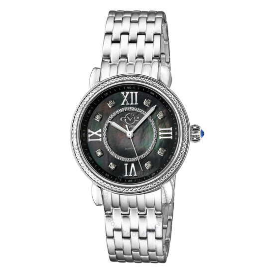 علبة وسوار من الفولاذ المقاوم للصدأ فضي اللون. إطار ثابت من الفولاذ المقاوم للصدأ فضي اللون. ميناء من عرق اللؤلؤ مع عقارب فضية اللون وعلامات ساعات من الألماس. علامات دقائق حول الحافة الخارجية. نوع الميناء: تناظري. حركة كوارتز. زجاج ياقوت مقاوم للخدش. تاج قابل للسحب/الدفع. غطاء خلفي صلب. شكل العلبة دائري، مقاس العلبة: 37 مم، سمكها: 9 مم. عرض السوار: 18 مم. مشبك قابل للطي بزر ضغط. مقاومة للماء حتى عمق 50 مترًا / 165 قدمًا. الوظائف: الساعات، الدقائق، الثواني. معلومات إضافية: 8 ماسات. سلسلة مارسالا. ساعة أنيقة. ساعة GV2 من جيفريل مارسالا كوارتز نسائية مرصعة بالألماس 9861B.