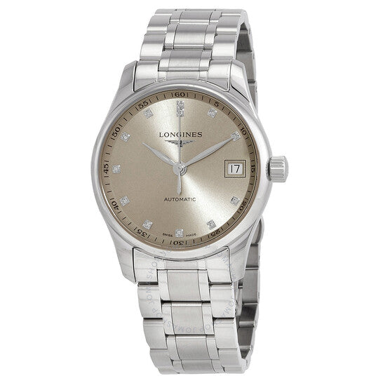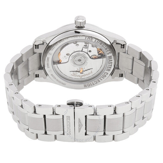 علبة وسوار من الفولاذ المقاوم للصدأ فضي اللون. إطار ثابت من الفولاذ المقاوم للصدأ فضي اللون. ميناء بني اللون مع عقارب فضية اللون وعلامات ساعات من الألماس. علامات دقائق حول الحافة الخارجية. نوع الميناء: تناظري. عرض التاريخ عند موضع الساعة 3. حركة لونجين أوتوماتيكية كاليبر L888، مبنية على ETA A31.L11، تحتوي على 21 جوهرة، تنبض بمعدل 25200 ذبذبة في الساعة، ولديها احتياطي طاقة يدوم حوالي 64 ساعة. زجاج ياقوت مقاوم للخدش. غطاء خلفي شفاف. شكل العلبة دائري، مقاسها 34 مم. مشبك قابل للطي مع مفتاح أمان. مقاومة للماء حتى عمق 30 مترًا / 100 قدم. الوظائف: التاريخ، الساعة، الدقيقة، الثانية. سلسلة ماستر. تصميم ساعة فاخرة. علامة الساعة: صناعة سويسرية. ساعة لونجين ماستر أوتوماتيكية نسائية مرصعة بالألماس بمينا بني، L2.357.4.07.6.