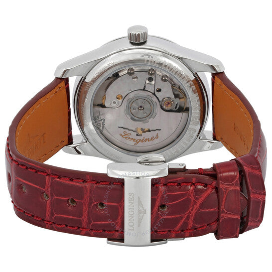 علبة من الفولاذ المقاوم للصدأ فضية اللون مع سوار أحمر من جلد التمساح. إطار ثابت من الفولاذ المقاوم للصدأ فضي اللون. ميناء من عرق اللؤلؤ مع عقارب فضية اللون وعلامات ساعات من الماس. علامات دقائق حول الحافة الخارجية. نوع الميناء: تناظري. عرض التاريخ عند موضع الساعة السادسة. ميناء فرعي واحد يعرض التاريخ/طور القمر. حركة لونجين كاليبر L899 أوتوماتيكية، مبنية على ETA A31.L91، تحتوي على 21 جوهرة، تنبض بمعدل 25200 ذبذبة في الساعة، ولديها احتياطي طاقة لمدة 64 ساعة تقريبًا. كريستال ياقوت مقاوم للخدش. تاج لولبي. غطاء خلفي شفاف. شكل العلبة دائري، مقاسها 34 مم. مشبك قابل للطي. مقاومة للماء حتى عمق 30 مترًا / 100 قدم. الوظائف: طور القمر، التاريخ، الساعة، الدقيقة، الثانية. معلومات إضافية: العلبة الأصلية، بطاقة ضمان دولية، دليل (ملحقات كاملة). سلسلة ماستر. طراز ساعة فاخرة. ملصق الساعة: صناعة سويسرية. ساعة لونجين ماستر أوتوماتيكية مرصعة بالماس للسيدات L2.409.4.87.2.