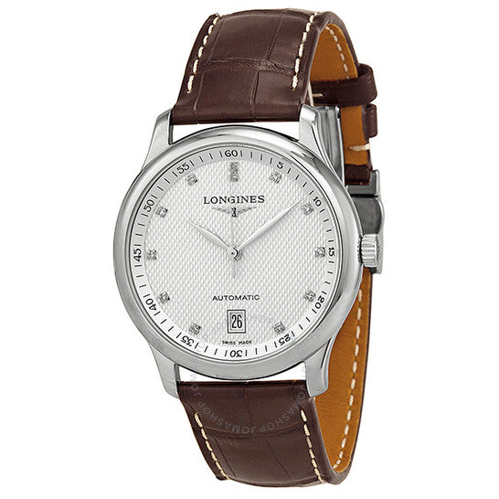 علبة من الفولاذ المقاوم للصدأ مع سوار جلدي بني. إطار ثابت مقبب من الفولاذ المقاوم للصدأ. ميناء فضي اللون بعقارب فضية اللون على شكل ورقة شجر وعلامات ساعات من الماس. علامات دقائق بأرقام عربية (بفاصل ٥ دقائق). علامات دقائق حول الحافة الخارجية. نوع الميناء: تناظري. نافذة عرض التاريخ فوق موضع الساعة السادسة. حركة لونجين أوتوماتيكية من عيار L619/888، مبنية على ETA 2892، تحتوي على ٢١ جوهرة، تنبض بتردد ٢٥٢٠٠ ذبذبة في الساعة، ولديها احتياطي طاقة يدوم حوالي ٦٤ ساعة. زجاج من الياقوت المقاوم للخدش. تاج قابل للسحب/الدفع. ظهر هيكلي. شكل دائري. حجم العلبة: ٣٨.٥ مم. سمكها: ٩.٥ مم. عرض السوار: ١٩ مم. مشبك تانغ. مقاومة للماء حتى عمق ٣٠ مترًا / ١٠٠ قدم. الوظائف: التاريخ، الساعة، الدقيقة، الثانية. سلسلة ماستر. طراز ساعة رسمية. ملصق الساعة: صناعة سويسرية. اختلافات المنتج: L26284773. ساعة لونجين ماستر أوتوماتيكية مرصعة بالألماس ومينا فضي للرجال L2.628.4.77.3.