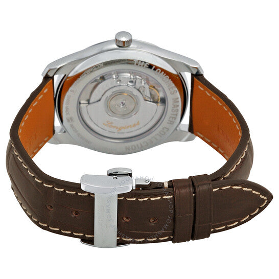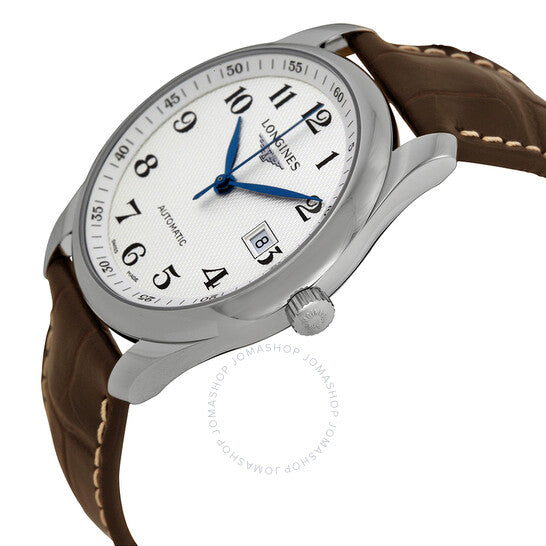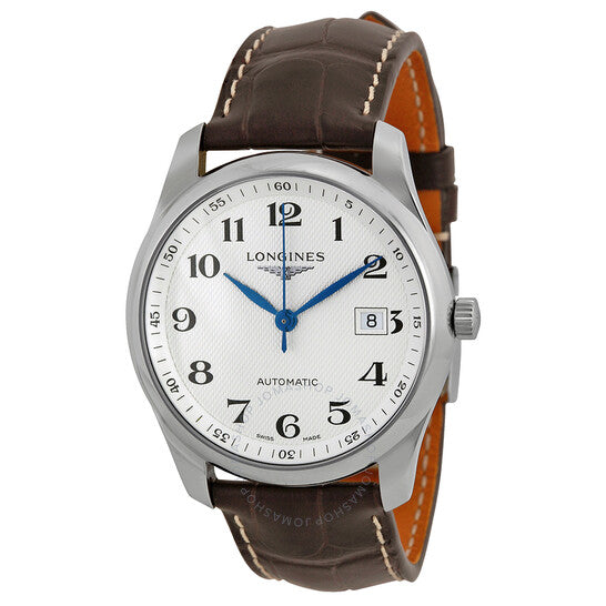 علبة من الفولاذ المقاوم للصدأ مع سوار من جلد التمساح البني. إطار ثابت من الفولاذ المقاوم للصدأ. ميناء فضي بعقارب زرقاء على شكل ورقة شجر وعلامات ساعات عربية سوداء. علامات دقائق حول الحافة الخارجية. نوع الميناء: تناظري. عرض التاريخ عند موضع الساعة الثالثة. حركة لونجين أوتوماتيكية من عيار L619/888، مبنية على ETA 2892، تحتوي على 21 جوهرة، تنبض بمعدل 25200 ذبذبة في الساعة، ولديها احتياطي طاقة لمدة 64 ساعة تقريبًا. زجاج من الياقوت المقاوم للخدش. تاج قابل للسحب/الدفع. ظهر هيكلي. شكل دائري. حجم العلبة: 40 مم. سمكها: 9.5 مم. عرض السوار: 21 مم. مشبك قابل للطي. مقاومة للماء حتى عمق 30 مترًا / 100 قدم. الوظائف: التاريخ، الساعة، الدقيقة، الثانية. سلسلة ماستر. طراز ساعة رسمية. علامة الساعة: صناعة سويسرية. ساعة لونجين ماستر أوتوماتيكية بمينا فضي وجلد بني، رقم L27934783.