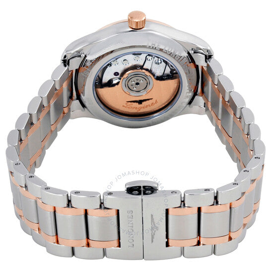 علبة من الفولاذ المقاوم للصدأ مع سوار من الفولاذ المقاوم للصدأ ثنائي اللون (فضي وذهبي وردي). إطار ثابت من الذهب الوردي. ميناء فضي مع عقارب زرقاء على شكل ورقة شجر وعلامات ساعات عربية. علامات الدقائق. علامات دقائق عربية (بفاصل 5 دقائق) حول الحافة الخارجية. نوع الميناء: تناظري. عرض التاريخ عند موضع الساعة 3. حركة لونجين كاليبر L595/592 أوتوماتيكية، مبنية على ETA 2000-1، تحتوي على 20 جوهرة، تنبض بمعدل 28800 ذبذبة في الساعة، ولديها احتياطي طاقة لمدة 40 ساعة تقريبًا. كريستال ياقوت مقاوم للخدش. تاج سحب/دفع. غطاء خلفي شفاف. شكل دائري. حجم العلبة: 29 مم. سمك العلبة: 9 مم. عرض السوار: 15 مم. مشبك بزر ضغط قابل للطي. مقاومة للماء حتى عمق 30 مترًا / 100 قدم. الوظائف: التاريخ، الساعة، الدقائق، الثواني. معلومات إضافية: غطاء الذهب هو عملية يُصنع فيها غطاء من الذهب لتركيبه على علبة من الفولاذ المقاوم للصدأ. سلسلة ماستر. طراز ساعة رسمية. علامة الساعة: صناعة سويسرية. تنوعات المنتج: L22575797. ساعة لونجين ماستر أوتوماتيكية نسائية بمينا فضي L2.257.5.79.7.