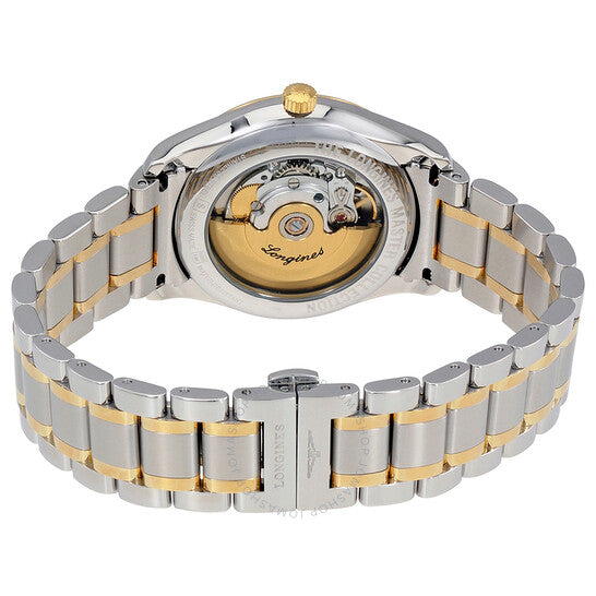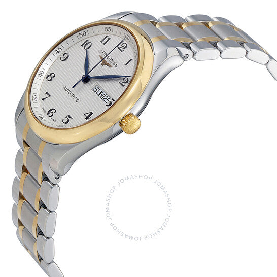 علبة من الفولاذ المقاوم للصدأ مع سوار من الفولاذ المقاوم للصدأ بوصلات من الذهب الأصفر عيار 18 قيراطًا. إطار ثابت من الذهب الأصفر عيار 18 قيراطًا. ميناء فضي بعقارب زرقاء وعلامات ساعات رقمية عربية. علامات دقائق رقمية عربية (بفاصل 5 دقائق). علامات دقائق حول الحافة الخارجية. نوع الميناء: تناظري. عرض يوم الأسبوع والتاريخ عند موضع الساعة 3. حركة أوتوماتيكية من لونجين، عيار L636، مبنية على ETA 2836، تحتوي على 25 جوهرة، ولديها احتياطي طاقة يبلغ حوالي 38 ساعة. زجاج ياقوت مقاوم للخدش. تاج قابل للسحب/الدفع. غطاء خلفي شفاف. شكل دائري. حجم العلبة: 38.5 مم. سمك العلبة: 9.5 مم. عرض السوار: 20 مم. مشبك قابل للطي بزر ضغط للتحرير. مقاومة للماء حتى عمق 30 مترًا / 100 قدم. الوظائف: التاريخ، اليوم، الساعة، الدقيقة، الثانية. سلسلة ماستر. طراز ساعة فاخرة. ملصق الساعة: صناعة سويسرية. ساعة لونجين ماستر أوتوماتيكية للرجال بمينا فضي L2.755.5.78.7.