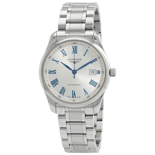 علبة وسوار من الفولاذ المقاوم للصدأ فضي اللون. إطار ثابت من الفولاذ المقاوم للصدأ فضي اللون. ميناء فضي اللون بعقارب زرقاء وعلامات ساعات رومانية. علامات دقائق حول الحافة الخارجية. نوع الميناء: تناظري. عرض التاريخ عند موضع الساعة 3. حركة لونجين كاليبر L888 أوتوماتيكية، مبنية على ETA A31.L11، تحتوي على 21 جوهرة، تنبض بمعدل 25200 ذبذبة في الساعة، ولديها احتياطي طاقة لمدة 64 ساعة تقريبًا. زجاج ياقوتي مقاوم للخدش. غطاء خلفي شفاف. شكل العلبة دائري، مقاسها 40 مم. مشبك قابل للطي مع مفتاح أمان. مقاومة للماء حتى عمق 30 مترًا / 100 قدم. الوظائف: التاريخ، الساعة، الدقيقة، الثانية. معلومات إضافية: العلبة الأصلية، بطاقة الضمان الدولية، دليل الاستخدام (ملحقات كاملة). سلسلة ماستر. طراز ساعة فاخرة. ملصق الساعة: صناعة سويسرية. ساعة لونجين ماستر أوتوماتيكية للرجال بمينا فضي، L2.793.4.79.6.