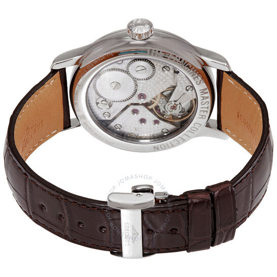 علبة من الفولاذ المقاوم للصدأ مع سوار جلدي بني. إطار ثابت من الفولاذ المقاوم للصدأ. ميناء فضي بعقارب زرقاء وعلامات ساعات بأرقام عربية. علامات دقائق بأرقام عربية (بفاصل ٥ دقائق). علامات دقائق حول الحافة الخارجية. نوع الميناء: تناظري. ميناء فرعي للثواني الصغيرة عند موضع الساعة ٩. حركة لونجين أوتوماتيكية من عيار L506.2 مع احتياطي طاقة ٥٣ ساعة. زجاج من الياقوت المقاوم للخدش. تاج قابل للسحب/الدفع. غطاء خلفي شفاف. شكل دائري. حجم العلبة: ٤٧.٥ مم. عرض السوار: ٢٥ مم. مشبك قابل للطي بزر ضغط. مقاومة للماء حتى عمق ٣٠ مترًا / ١٠٠ قدم. الوظائف: الساعات، الدقائق، الثواني. سلسلة ماستر. طراز ساعة رسمية. علامة الساعة: صناعة سويسرية. ساعة لونجين ماستر أوتوماتيكية للرجال بمينا فضي، L28414185.