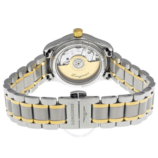 علبة من الفولاذ المقاوم للصدأ مع سوار من الفولاذ المقاوم للصدأ بوصلات من الذهب الأصفر عيار 18 قيراطًا. إطار ثابت من الذهب الأصفر عيار 18 قيراطًا. ميناء أبيض بعقارب ذهبية اللون على شكل أوراق شجر وعلامات ساعات على شكل عصا. علامات دقائق حول الحافة الخارجية. نوع الميناء: تناظري. عرض التاريخ عند موضع الساعة 3. حركة لونجين أوتوماتيكية من عيار L595/592، مبنية على ETA 2000-1، تحتوي على 20 جوهرة، تنبض بمعدل 28800 ذبذبة في الساعة، ولديها احتياطي طاقة لمدة 40 ساعة تقريبًا. زجاج من الياقوت المقاوم للخدش. تاج قابل للسحب/الدفع. ظهر هيكلي. شكل دائري. حجم العلبة: 25.5 مم. سمك العلبة: 9 مم. عرض السوار: 14 مم. مشبك قابل للطي بزر ضغط للتحرير. مقاومة للماء حتى عمق 30 مترًا / 100 قدم. الوظائف: التاريخ، الساعة، الدقيقة، الثانية. سلسلة ماستر. تصميم ساعة كاجوال. علامة الساعة: صناعة سويسرية. إصدارات المنتج: L2 128 5 12 7، L2-128-5-12-7، L2/128/5/12/7، L21285127. ساعة لونجين ماستر أوتوماتيكية نسائية بمينا أبيض L21285127.