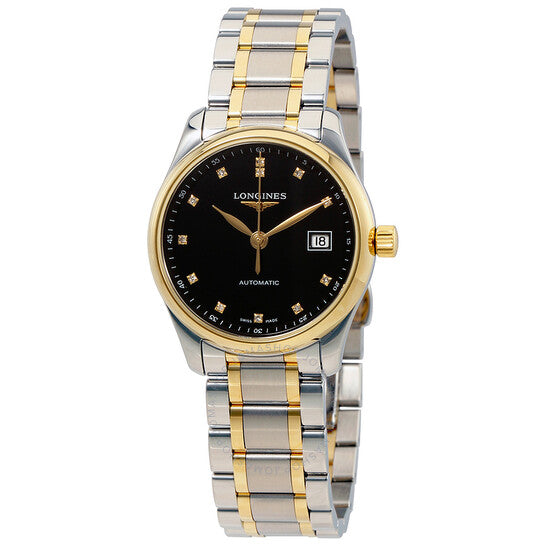 علبة من الفولاذ المقاوم للصدأ بلونين مع سوار من الفولاذ المقاوم للصدأ بلونين. إطار ثابت. ميناء أسود بعقارب ذهبية اللون وعلامات ساعات مرصعة بالألماس. علامات دقائق حول الحافة الخارجية. نوع الميناء: تناظري. عرض التاريخ عند موضع الساعة 3. حركة أوتوماتيكية. زجاج ياقوت مقاوم للخدش. غطاء خلفي شفاف هيكلي. حجم العلبة: 29 مم. شكل العلبة دائري. إبزيم قابل للطي بزر ضغط. مقاومة للماء حتى عمق 30 مترًا / 100 قدم. الوظائف: التاريخ، الساعة، الدقائق، الثواني. تصميم ساعة فاخرة. علامة الساعة: صناعة سويسرية. ساعة لونجين ماستر بلاك دايموند نسائية L22575577.