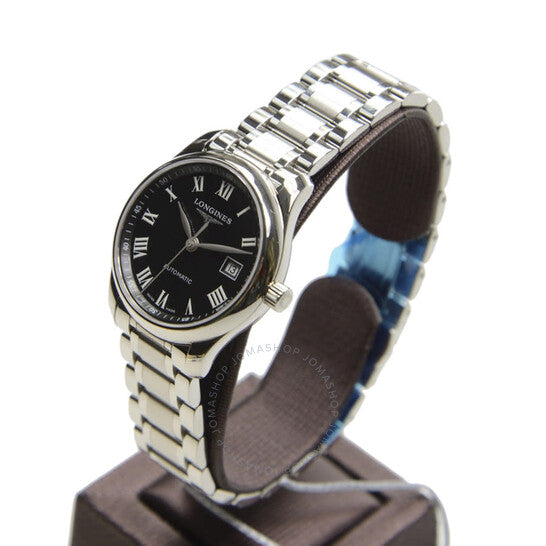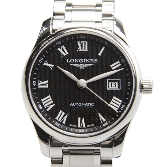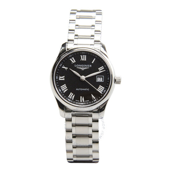 علبة وسوار من الفولاذ المقاوم للصدأ فضي اللون. إطار ثابت من الفولاذ المقاوم للصدأ فضي اللون. ميناء أسود بعقارب فضية اللون وعلامات ساعات رومانية. علامات دقائق عربية (بفاصل 5 دقائق). نوع الميناء: تناظري. عرض التاريخ عند موضع الساعة 3. حركة لونجين أوتوماتيكية من طراز L595، مبنية على ETA 2000/1، تحتوي على 20 جوهرة، تنبض بمعدل 28800 ذبذبة في الساعة، ولديها احتياطي طاقة يصل إلى 40 ساعة تقريبًا. زجاج من الياقوت المقاوم للخدش. تاج قابل للسحب/الدفع. غطاء خلفي شفاف. شكل العلبة دائري، مقاسها 29 مم. مشبك قابل للطي مع مفتاح أمان. مقاومة للماء حتى عمق 30 مترًا / 100 قدم. الوظائف: التاريخ، الساعة، الدقيقة، الثانية. سلسلة ماستر كوليكشن. تصميم ساعة كاجوال. علامة الساعة: صناعة سويسرية. ساعة لونجين ماستر كوليكشن أوتوماتيكية نسائية بمينا أسود، L2.257.4.51.6.