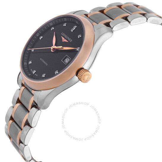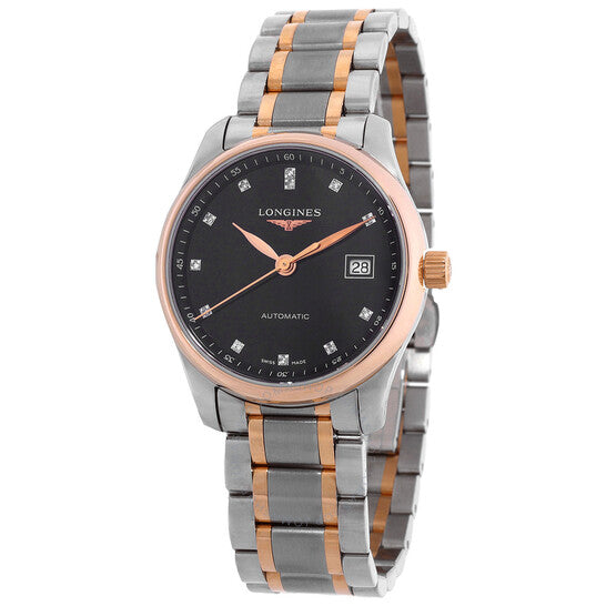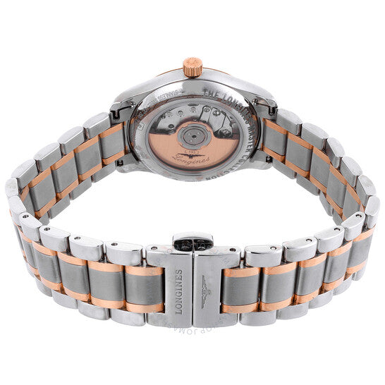 علبة من الفولاذ المقاوم للصدأ بلون فضي مع سوار من الفولاذ المقاوم للصدأ بلونين (فضي وذهبي وردي) وذهب وردي عيار 18 قيراطًا. إطار ثابت من الذهب الوردي عيار 18 قيراطًا. ميناء أسود مع عقارب بلون ذهبي وردي وعلامات ساعات من الماس. علامات دقائق حول الحافة الخارجية. نوع الميناء: تناظري. عرض التاريخ عند موضع الساعة 3. حركة لونجين كاليبر L595 أوتوماتيكية، مبنية على ETA 2000/1، تحتوي على 20 جوهرة، تنبض بمعدل 28800 ذبذبة في الساعة، ولديها احتياطي طاقة لمدة 40 ساعة تقريبًا. كريستال ياقوت مقاوم للخدش. تاج قابل للسحب/الدفع. غطاء خلفي شفاف. شكل العلبة دائري، حجم العلبة: 29 مم، سمك العلبة: 9 مم. مشبك قابل للطي بزر ضغط. مقاومة للماء حتى عمق 30 مترًا / 100 قدم. الوظائف: التاريخ، الساعة، الدقيقة، الثانية. سلسلة ماستر كوليكشن. طراز ساعة رسمية. ملصق الساعة: صنع سويسري. ساعة لونجين ماستر كوليكشن أوتوماتيكية للسيدات بمينا أسود L2.257.5.59.7.