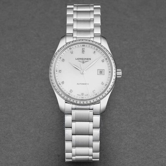 علبة وسوار من الفولاذ المقاوم للصدأ بلون فضي. إطار ثابت من الفولاذ المقاوم للصدأ بلون فضي مرصع بالألماس. ميناء من عرق اللؤلؤ مع عقارب فضية اللون وعلامات ساعات من الألماس. علامات دقائق حول الحافة الخارجية. نوع الميناء: تناظري. عرض التاريخ عند موضع الساعة 3. حركة لونجين كاليبر L595 أوتوماتيكية، مبنية على ETA 2000/1، تحتوي على 20 جوهرة، تنبض بمعدل 28800 ذبذبة في الساعة، ولديها احتياطي طاقة لمدة 40 ساعة تقريبًا. كريستال ياقوت مقاوم للخدش. تاج قابل للسحب/الدفع. غطاء خلفي شفاف. شكل العلبة دائري، مقاسها: 29 مم، سمكها: 8.50 مم. عرض السوار: 15 مم. مشبك أمان ثلاثي الطي وفتح بزر دفع. مقاومة للماء حتى عمق 30 مترًا / 100 قدم. الوظائف: التاريخ، الساعة، الدقيقة، الثانية. سلسلة ماستر كوليكشن. طراز ساعة رسمية. ملصق الساعة: صناعة سويسرية. ساعة لونجين ماستر كوليكشن أوتوماتيكية مرصعة بالألماس للسيدات L2.257.0.87.6.
