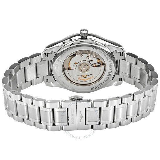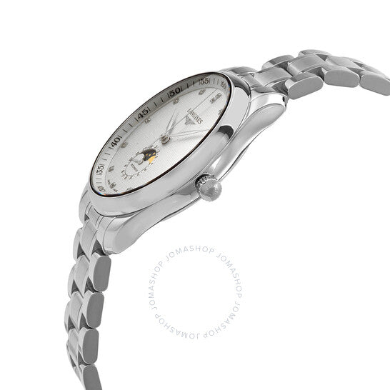 علبة من الفولاذ المقاوم للصدأ مع سوار من الفولاذ المقاوم للصدأ. إطار ثابت من الفولاذ المقاوم للصدأ. ميناء فضي اللون من نوع "barleycorn" بعقارب فضية اللون وعلامات ساعات من الألماس. علامات دقائق بأرقام عربية (بفاصل 5 دقائق). علامات دقائق حول الحافة الخارجية. نوع الميناء: تناظري. نافذة عرض التاريخ عند موضع الساعة السادسة. موانئ فرعية لعرض التاريخ/أطوار القمر. حركة لونجين الأوتوماتيكية عيار L899، مبنية على ETA A31.L91، تحتوي على 21 جوهرة، تنبض بتردد 25200 ذبذبة في الساعة، وتحتفظ باحتياطي طاقة يدوم حوالي 64 ساعة. زجاج ياقوتي مقاوم للخدش. تاج قابل للسحب/الدفع. غطاء خلفي شفاف. شكل دائري. حجم العلبة: 42 مم. سمكها: 11.20 مم. عرض السوار: 21 مم. مشبك قابل للطي. مقاومة للماء حتى عمق 30 مترًا/100 قدم. الوظائف: التاريخ، الساعة، الدقائق، الثواني، أطوار القمر. معلومات إضافية: ميناء مرصع بـ ١٣ ماسة ويسلتون فائقة الجودة (٠٫٠٥٩ قيراط). من سلسلة ماستر كوليكشن. طراز ساعة رسمية. علامة الساعة: صناعة سويسرية. ساعة لونجين ماستر كوليكشن أوتوماتيكية للرجال مرصعة بالألماس، رقم الموديل L2.919.4.77.6.
