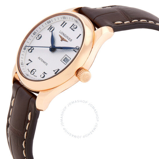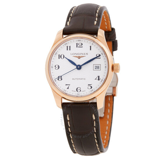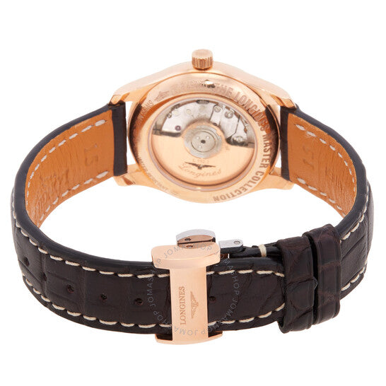 علبة من الذهب الوردي عيار 18 قيراطًا، مع سوار بني من جلد التمساح. إطار ثابت. ميناء فضي. نوع الميناء: تناظري. حركة لونجين أوتوماتيكية بعيار L595، مبنية على ETA 2000/1، تحتوي على 20 جوهرة، تنبض بتردد 28800 ذبذبة في الساعة، وتحتفظ باحتياطي طاقة يدوم حوالي 40 ساعة. زجاج من الياقوت المقاوم للخدش. تاج قابل للسحب/الدفع. غطاء خلفي شفاف. شكل العلبة دائري، مقاسها: 29 مم، سمكها: 9 مم. مشبك قابل للطي. مقاومة للماء حتى عمق 30 مترًا/100 قدم. الوظائف: التاريخ، الساعة، الدقيقة، الثانية. من سلسلة ماستر كوليكشن. علامة الساعة: صناعة سويسرية. ساعة لونجين ماستر كوليكشن أوتوماتيكية نسائية بمينا فضي، L2.257.8.78.3.