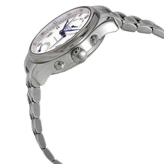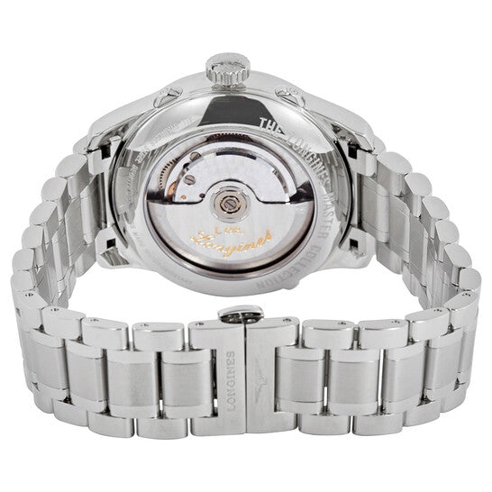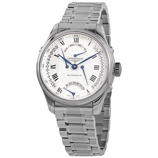 علبة من الفولاذ المقاوم للصدأ مع سوار من الفولاذ المقاوم للصدأ. إطار ثابت من الفولاذ المقاوم للصدأ. ميناء فضي بعقارب زرقاء وعلامات ساعات رومانية. علامات دقائق حول الحافة الخارجية. نوع الميناء: تناظري. تاريخ رجعي. أربعة مؤشرات للثواني، ٢٤ ساعة، التاريخ، ويوم الأسبوع. حركة أوتوماتيكية من لونجين، عيار L698، مع احتياطي طاقة لمدة ٤٦ ساعة. زجاج من الياقوت المقاوم للخدش. تاج قابل للسحب/الدفع. غطاء خلفي شفاف. شكل دائري. حجم العلبة: ٤١ مم. سمكها: ١٦.١٠ مم. عرض السوار: ٢٢ مم. مشبك قابل للطي. مقاومة للماء حتى عمق ٣٠ مترًا / ١٠٠ قدم. الوظائف: التاريخ، اليوم، توقيت غرينتش، المنطقة الزمنية الثانية، الساعة، الدقيقة، الثانية. تصميم ساعة فاخرة. علامة الساعة: صناعة سويسرية. ساعة لونجين ماستر كوليكشن أوتوماتيكية للرجال بمينا فضي، L2.715.4.71.6.