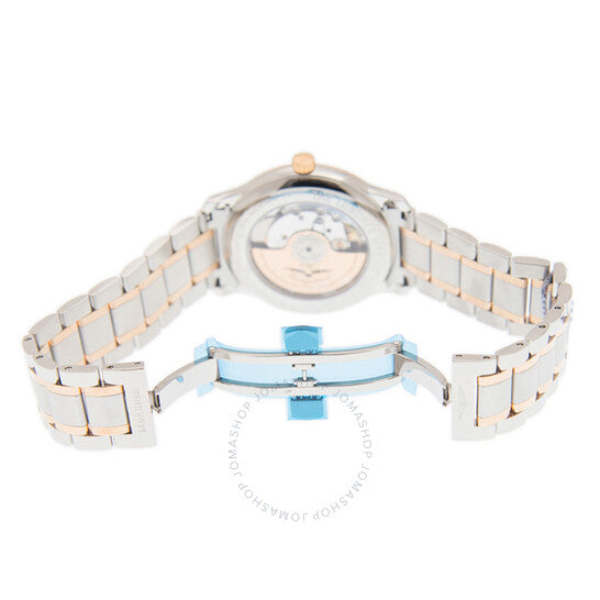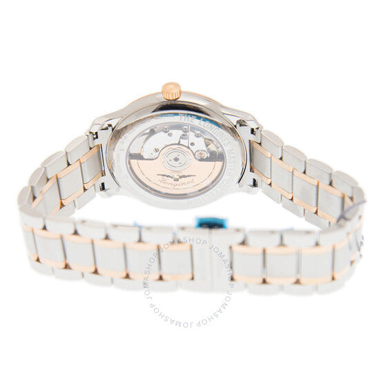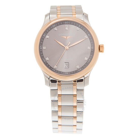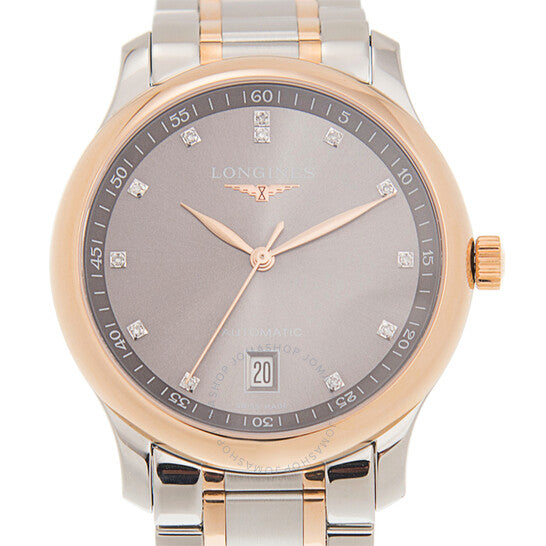 علبة من الذهب الوردي عيار ١٨ قيراطًا، مع سوار من الفولاذ المقاوم للصدأ بلونين (فضي وذهبي وردي). إطار ثابت من الذهب الوردي عيار ١٨ قيراطًا. ميناء رمادي اللون مع عقارب بلون ذهبي وردي وعلامات ساعات من الألماس. علامات دقائق حول الحافة الخارجية. نوع الميناء: تناظري. عرض التاريخ عند موضع الساعة ٣. حركة أوتوماتيكية من لونجين كاليبر L619 مع احتياطي طاقة لمدة ٤٢ ساعة. زجاج ياقوت مقاوم للخدش. غطاء خلفي شفاف. شكل العلبة دائري، مقاسها: ٣٨.٥ مم، سمكها: ٩.٥ مم. عرض السوار: ٢٠ مم. مشبك أمان ثلاثي الطي. مقاومة للماء حتى عمق ٣٠ مترًا / ١٠٠ قدم. الوظائف: التاريخ، الساعة، الدقيقة، الثانية. طراز ساعة رسمية. علامة الساعة: صناعة سويسرية. ساعة لونجين ماستر كوليكشن أوتوماتيكية للرجال بمينا رمادي مرصعة بالألماس L2.628.5.07.7.