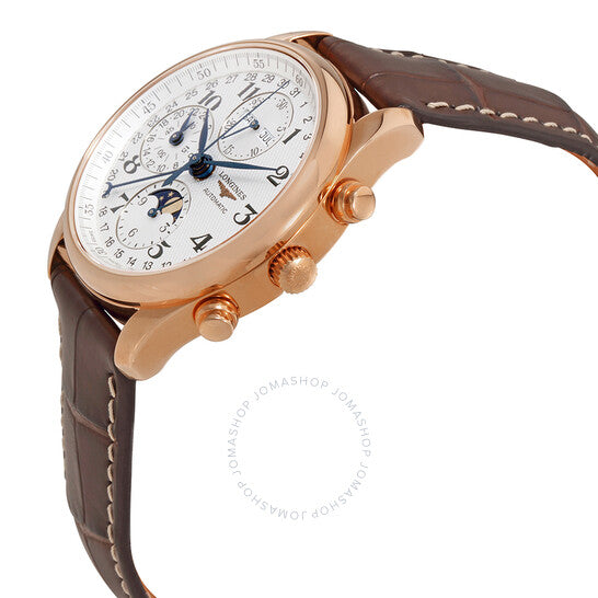 علبة من الذهب الوردي عيار ١٨ قيراطًا مع سوار جلدي بني. إطار ثابت من الذهب الوردي عيار ١٨ قيراطًا. ميناء فضي بعقارب زرقاء وعلامات ساعات رقمية عربية. عداد تاريخ (مؤشر). علامات دقائق حول الحافة الخارجية. نوع الميناء: تناظري. كرونوغراف - ثلاثة أقراص فرعية تعرض: ٣٠ دقيقة، ١٢ ساعة (طور القمر الداخلي)، ٢٤ ساعة (٦٠ ثانية). حركة أوتوماتيكية من لونجين، عيار ٦٧٨، مع احتياطي طاقة ٤٢ ساعة. زجاج ياقوت مقاوم للخدش. غطاء خلفي شفاف. حجم العلبة: ٤٠ مم. شكلها دائري. مشبك قابل للطي. مقاومة للماء حتى عمق ٣٠ مترًا / ١٠٠ قدم. الوظائف: كرونوغراف، تاريخ، ساعة، دقيقة، ثانية، طور القمر. تصميم ساعة فاخرة. علامة الساعة: صناعة سويسرية. ساعة لونجين ماستر كوليكشن كرونوغراف رجالية L2.673.8.78.5.