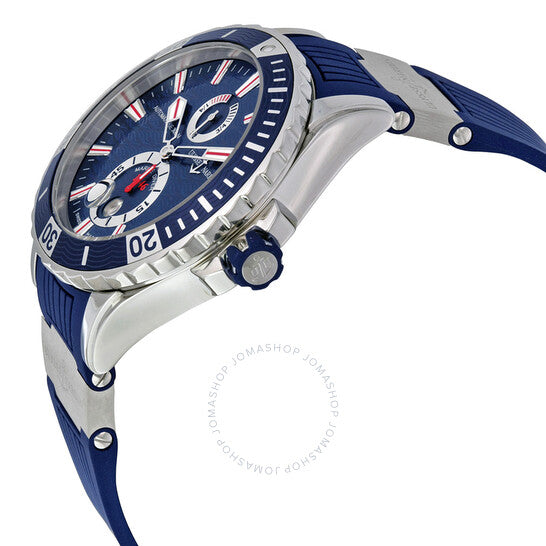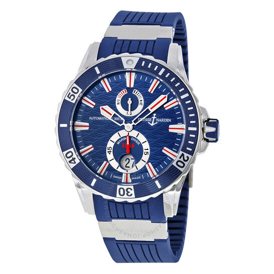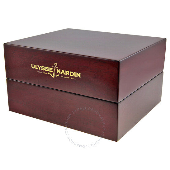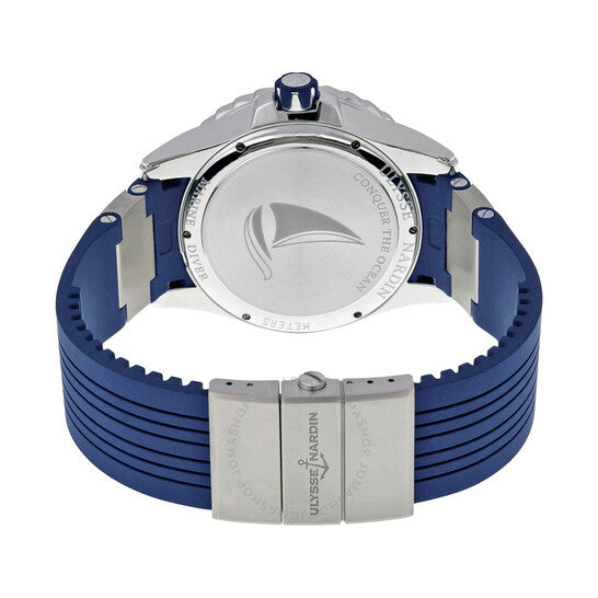 علبة فضية اللون من الفولاذ المقاوم للصدأ مع سوار أزرق من المطاط والتيتانيوم. إطار دوار أحادي الاتجاه من الفولاذ المقاوم للصدأ بحافة عملة معدنية مع حلقة علوية للعد التصاعدي للوقت المنقضي مرصعة بالمطاط الأزرق. ميناء أزرق مع عقارب وعلامات ساعات فضية مضيئة. علامات دقائق حول الحافة الخارجية. نوع الميناء: تناظري. عقارب وعلامات مضيئة. عرض التاريخ عند موضع الساعة 6. ميناءان فرعيان يعرضان: ثانية صغيرة ومؤشر احتياطي الطاقة. حركة أوتوماتيكية من طراز Ulysse Nardin Calibre UN-26، تحتوي على 28 جوهرة، تنبض بمعدل 28800 ذبذبة في الساعة، ولديها احتياطي طاقة لمدة 42 ساعة تقريبًا. زجاج من الياقوت المقاوم للخدش. تاج لولبي. ظهر صلب. شكل دائري، حجم العلبة: 44 مم، سمك العلبة: 16 مم. عرض السوار: 20 مم، طول السوار: 8 بوصات. قابلة للطي بمشبك بزر ضغط للفتح. مقاومة للماء حتى عمق 300 متر / 1000 قدم. الوظائف: التاريخ، الساعات، الدقائق، الثواني، مؤشر احتياطي الطاقة، الكرونومتر. سلسلة ماكسي مارين دايفر. تصميم ساعة فاخر. علامة الساعة: صناعة سويسرية. ساعة أوليس ناردين ماكسي مارين دايفر أوتوماتيكية للرجال 263-10-3-93.
