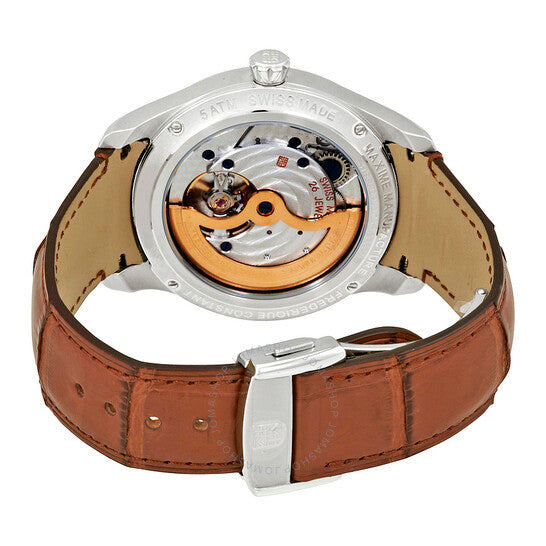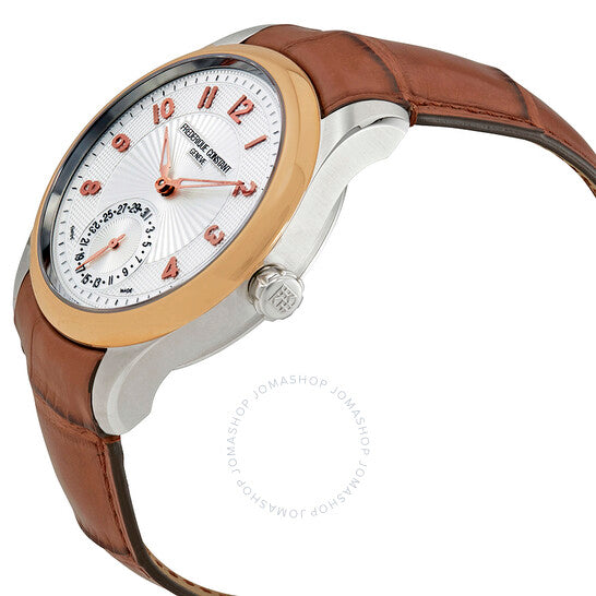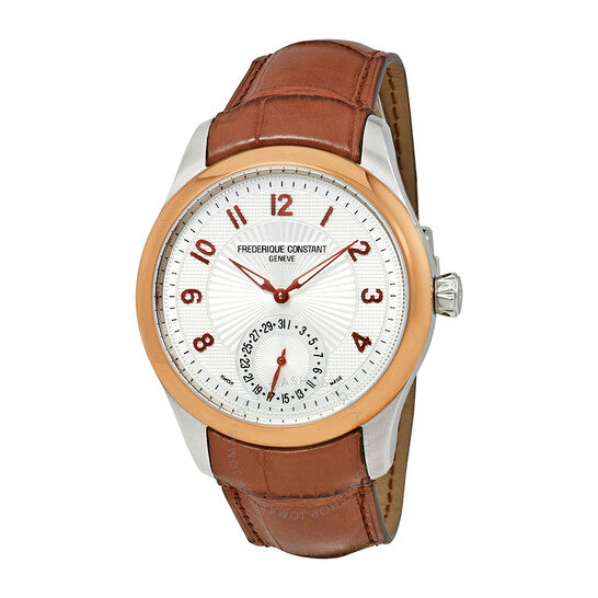 علبة من الفولاذ المقاوم للصدأ مع سوار جلدي بني. إطار ثابت بلون الذهب الوردي. ميناء فضي بعقارب بلون الذهب الوردي وعلامات ساعات رقمية عربية. نوع الميناء: تناظري. نافذة التاريخ عند موضع الساعة السادسة. ميناء فرعي للتاريخ عند موضع الساعة السادسة. حركة أوتوماتيكية من عيار فريدريك كونستانت FC-700. زجاج ياقوت مقاوم للخدش. تاج قابل للسحب/الدفع. حجم العلبة: 43 مم. سُمكها: 11 مم. شكلها دائري. مقاومة للماء حتى عمق 30 مترًا / 100 قدم. الوظائف: التاريخ، الساعة، الدقائق. علامة الساعة: صناعة سويسرية. إصدارات المنتج: FC 700AS5MZ9، FC700AS5MZ9، FC700AS5MZ9. ساعة فريدريك كونستانت ماكسيم الأوتوماتيكية للرجال بمينا فضي، FC-700AS5MZ9.