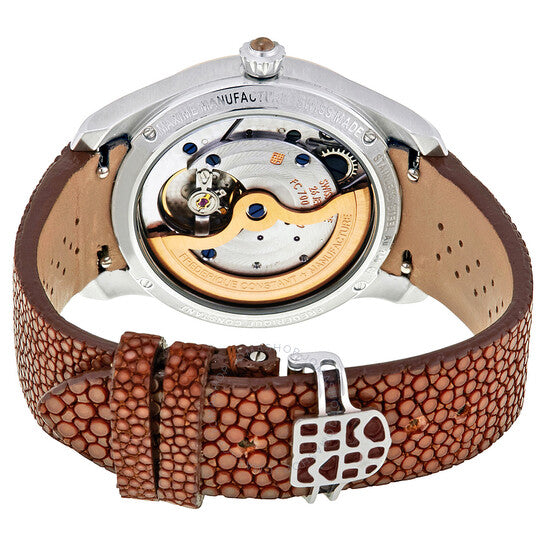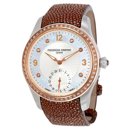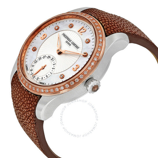 علبة من الفولاذ المقاوم للصدأ مع سوار ساتان بني. إطار ثابت من الذهب الوردي عيار 18 قيراطًا مرصع بالألماس. ميناء من عرق اللؤلؤ مع عقارب مضيئة من الذهب الوردي وعلامات ساعات من الألماس. أرقام عربية تشير إلى موضعي الساعة 3 و12. علامات دقائق حول الحافة الخارجية. نوع الميناء: تناظري. عقارب مضيئة. نافذة عرض التاريخ عند موضع الساعة 6. ميناء فرعي للتاريخ. حركة أوتوماتيكية من عيار فريدريك كونستانت FC-700 مع احتياطي طاقة لمدة 42 ساعة. زجاج ياقوت مقاوم للخدش. تاج لولبي. ظهر هيكل عظمي. حجم العلبة: 39 مم. سمكها: 11.3 مم. شكل دائري. مشبك تانغ. مقاومة للماء حتى عمق 30 مترًا / 100 قدم. الوظائف: التاريخ، الساعة، الدقائق. طراز ساعة رسمية. ملصق الساعة: صناعة سويسرية. ساعة فريدريك كونستانت ماكسيم نسائية بمينا أبيض وسوار نسيجي أبيض FC-700MPWD3MDZ9-BR.
