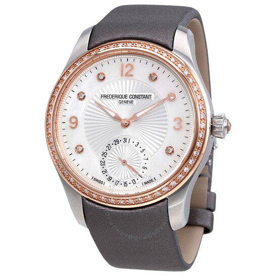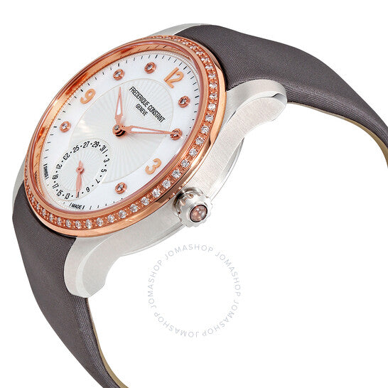 علبة من الفولاذ المقاوم للصدأ مع سوار رمادي من الساتان. إطار ثابت من الذهب الوردي عيار 18 قيراطًا مرصع بالألماس. ميناء أبيض من عرق اللؤلؤ مع عقارب مضيئة من الذهب الوردي وعلامات ساعات من الألماس. أرقام عربية تشير إلى موضعي الساعة 3 و12. علامات دقائق حول الحافة الخارجية. نوع الميناء: تناظري. عقارب مضيئة. عرض التاريخ عند موضع الساعة 6. تاريخ واحد. حركة أوتوماتيكية من عيار فريدريك كونستانت FC-700 مع احتياطي طاقة يبلغ حوالي 42 ساعة. زجاج من الياقوت المقاوم للخدش. تاج لولبي. ظهر هيكل عظمي. حجم العلبة: 39 مم. سمكها: 11.3 مم. شكل دائري. مشبك تانغ. مقاومة للماء حتى عمق 30 مترًا / 100 قدم. الوظائف: التاريخ، الساعة، الدقائق. طراز ساعة رسمية. علامة الساعة: صناعة سويسرية. ساعة فريدريك كونستانت ماكسيم نسائية بمينا بيضاء ونسيج أبيض FC-700MPWD3MDZ9-GR.
