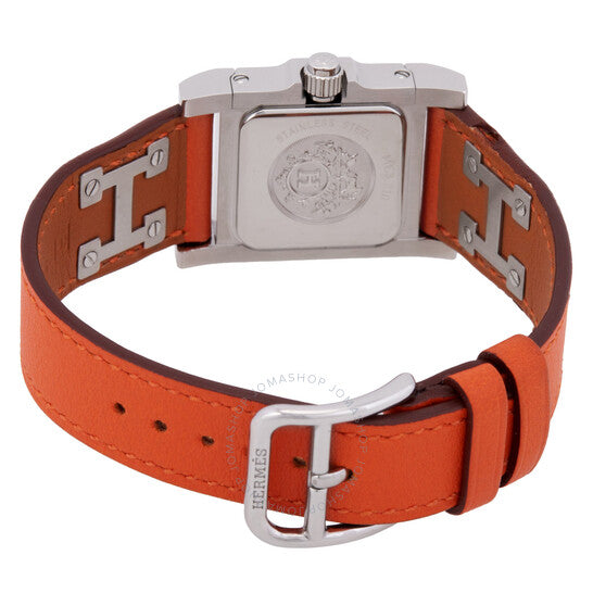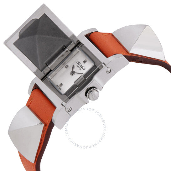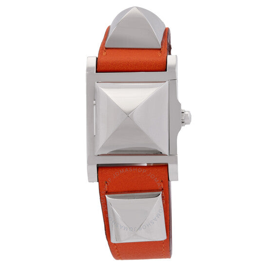 علبة من الفولاذ المقاوم للصدأ فضية اللون مع سوار جلدي برتقالي. إطار ثابت من الفولاذ المقاوم للصدأ فضي اللون. ميناء فضي أوبالين مع عقارب فضية اللون. نوع الميناء: تناظري. حركة كوارتز. زجاج ياقوت مقاوم للخدش. تاج قابل للسحب/الدفع. غطاء خلفي صلب. شكل العلبة مربع، مقاسها: ٢٣ مم × ٢٣ مم. مشبك بإبزيم. مقاومة للماء حتى عمق ٣٠ مترًا / ١٠٠ قدم. الوظائف: الساعات، الدقائق. سلسلة ميدور بي إم. اسم الساعة: صناعة سويسرية. ساعة هيرمس ميدور بي إم كوارتز نسائية 028326WW00.