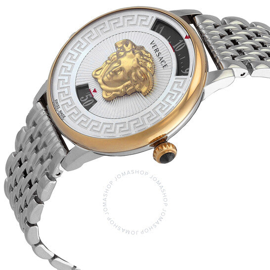 علبة وسوار من الفولاذ المقاوم للصدأ فضي اللون. إطار ثابت من الفولاذ المقاوم للصدأ ذهبي اللون. ميناء فضي بأرقام عربية. نوع الميناء: تناظري. حركة كوارتز. زجاج ياقوت مقاوم للخدش. تاج قابل للسحب/الدفع. غطاء خلفي صلب. شكل العلبة دائري، مقاسها: 38 مم. إبزيم قابل للطي بزر ضغط. مقاومة للماء حتى عمق 50 مترًا / 165 قدمًا. الوظائف: الساعات، الدقائق. سلسلة ميدوسا أيكون. تصميم ساعة فاخرة. علامة الساعة: صناعة سويسرية. ساعة فيرساتشي ميدوسا أيكون كوارتز نسائية بمينا فضي، VEZ200321.