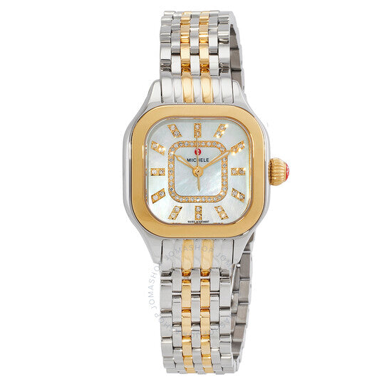 علبة من الفولاذ المقاوم للصدأ فضية اللون، مع سوار من الفولاذ المقاوم للصدأ ثنائي اللون (فضي وذهبي أصفر). إطار ثابت من الفولاذ المقاوم للصدأ ذهبي أصفر. ميناء من عرق اللؤلؤ مع عقارب ذهبية صفراء وعلامات ساعات من الألماس. نوع الميناء: تناظري. حركة كوارتز. هيكل مربع الشكل، مقاسه ٢٩ مم. مشبك قابل للطي مع قفل أمان. مقاومة للماء حتى عمق ٥٠ مترًا / ١٦٥ قدمًا. الوظائف: الساعات، الدقائق، الثواني. سلسلة ميجي. تصميم كاجوال. علامة الساعة: صناعة سويسرية. ساعة ميشيل ميجي كوارتز نسائية مرصعة بالألماس MWW33B000009.