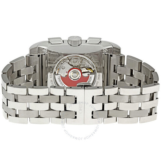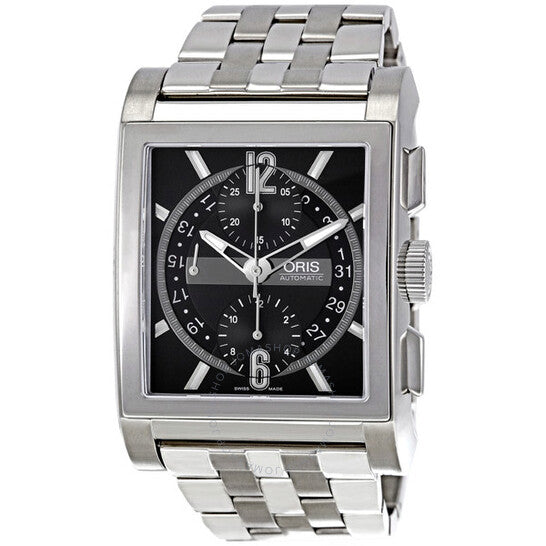 علبة من التيتانيوم مع سوار من الفولاذ المقاوم للصدأ. إطار ثابت من التيتانيوم. ميناء أسود بعقارب مضيئة وعلامات ساعات على شكل عصا. أرقام عربية تُشير إلى موضعي الساعة 6 و12. علامات دقائق على الحافة الخارجية. مقياس توقيت غرينتش. عرض التاريخ عند موضع الساعة 6. كرونوغراف - ثلاثة أقراص فرعية تعرض: الثواني المستمرة، 30 دقيقة، و12 ساعة. حركة أوتوماتيكية ذاتية التعبئة. زجاج من الياقوت المقاوم للخدش. غطاء خلفي هيكلي لولبي. قطر العلبة: 38 مم × 43 مم. مشبك قابل للطي. مقاومة للماء حتى عمق 30 مترًا / 100 قدم. ساعة أوريس كرونوغراف مستطيلة للرجال من التيتانيوم، 674-7625-7064MB.