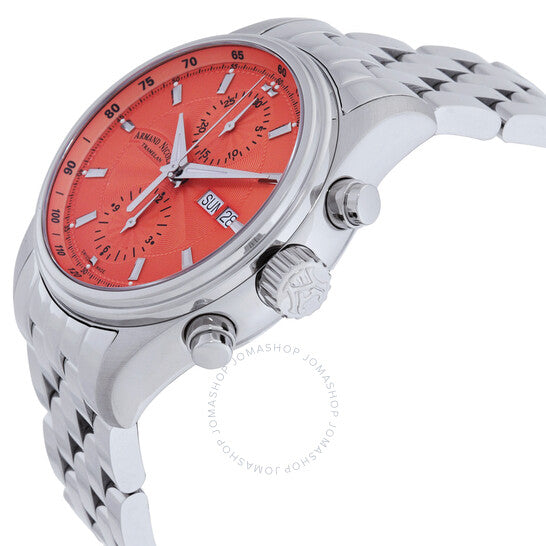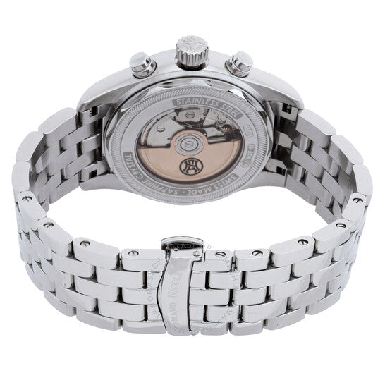 علبة وسوار من الفولاذ المقاوم للصدأ. إطار ثابت من الفولاذ المقاوم للصدأ فضي اللون. ميناء بلون السلمون مع عقارب وعلامات ساعات فضية اللون. علامات دقائق بأرقام عربية (بفاصل 5 دقائق). علامات دقائق وعلامات تاكيميتر حول الحافة الخارجية. نوع الميناء: تناظري. عقارب وعلامات مضيئة. عرض يوم الأسبوع والتاريخ عند موضع الساعة 3. كرونوغراف - يعرض الميناءان الفرعيان: دقيقتان و30 دقيقة و12 ساعة. حركة أوتوماتيكية من سيليتا كاليبر SW500، تحتوي على 25 جوهرة، تنبض بمعدل 28800 ذبذبة في الساعة، ولديها احتياطي طاقة لمدة 44 ساعة تقريبًا. زجاج ياقوت مقاوم للخدش. غطاء خلفي شفاف. شكل العلبة دائري، حجمها: 43 مم. مشبك قابل للطي بزر ضغط. مقاومة للماء حتى عمق 100 متر / 330 قدمًا. الوظائف: كرونوغراف، تاريخ، يوم، ساعة، دقيقة، ثانية صغيرة. سلسلة Mh2. طراز ساعة رسمية. علامة الساعة: صناعة سويسرية. ساعة أرماند نيكوليه MH2 كرونوغراف أوتوماتيكية للرجال A647A-SM-MA2640A.