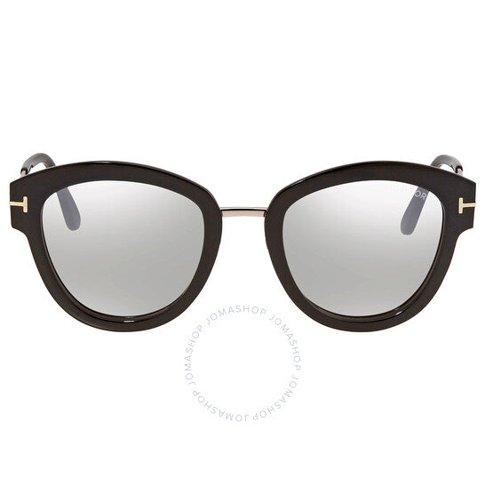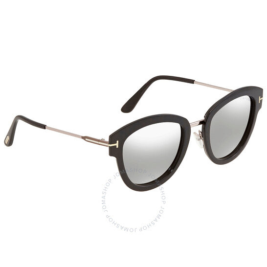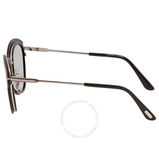 نظارات شمسية من توم فورد. سلسلة ميا. رقم السلسلة: FT0574. رمز اللون: 14C. المقاس: 52. الشكل: دائري. عرض العدسة: 52 مم. جسر العدسة: 22 مم. طول الذراع: 140 مم. حماية 100% من الأشعة فوق البنفسجية. غير مستقطب. مادة الإطار: معدن. لون الإطار: روثينيوم فاتح لامع. نوع العدسات: مرآة دخانية. نمط الحافة: حافة كاملة. رمز UPC/EAN: 664689901920. نظارات شمسية توم فورد ميا دائرية نسائية بمرآة دخانية، FT0574 14C 52.