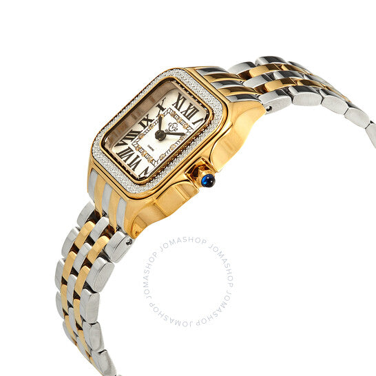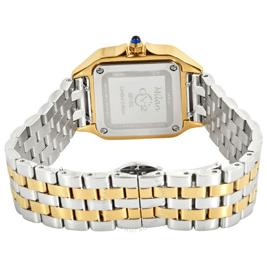 علبة من الفولاذ المقاوم للصدأ بلون الذهب الأصفر، مع سوار من الفولاذ المقاوم للصدأ بلونين (فضي وذهبي أصفر). إطار ثابت بلون الذهب الأصفر. ميناء أبيض بعقارب سوداء وعلامات ساعات بأرقام رومانية. مقياس دقائق حول الحافة الداخلية. نوع الميناء: تناظري. حركة كوارتز روندا عيار 762. زجاج ياقوت مقاوم للخدش. تاج قابل للسحب/الدفع. غطاء خلفي صلب. شكل العلبة مربع. حجم العلبة: 27.5 مم. سمكها: 9 مم. عرض السوار: 16 مم. مشبك قابل للطي بزر ضغط. مقاومة للماء حتى عمق 50 مترًا / 165 قدمًا. الوظائف: ساعة، دقيقة. سلسلة ميلانو. تصميم عصري. اسم الساعة: سويس موف. ساعة GV2 من جيفريل ميلانو كوارتز بمينا بيضاء للسيدات، 12113B.