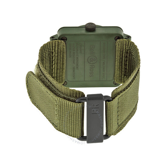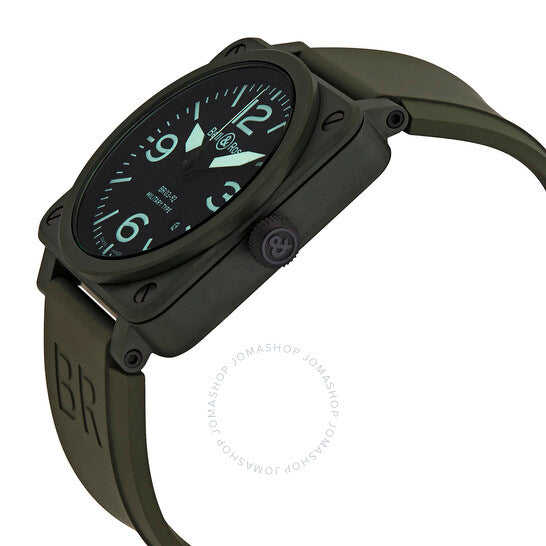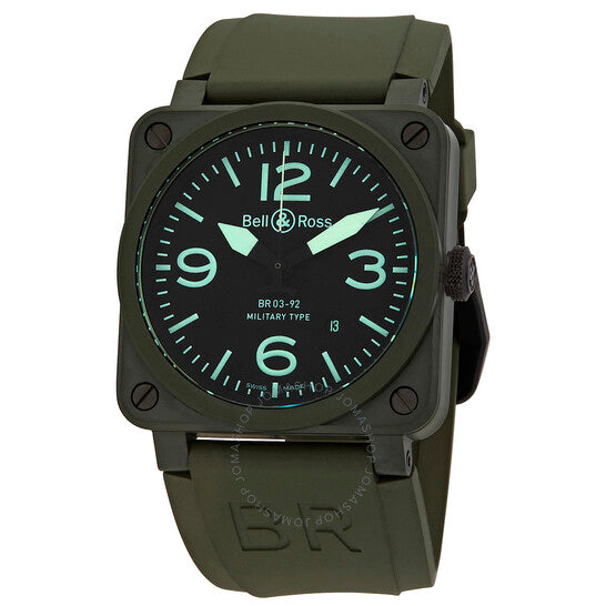 علبة من السيراميك بلون كاكي غير لامع مع سوار مطاطي أخضر. إطار ثابت من السيراميك بلون كاكي. ميناء أسود بعقارب مضيئة ومؤشرات ساعات. أرقام عربية تُشير إلى الساعات 3 و6 و9 و12. مؤشرات دقائق حول الحافة الخارجية. نوع الميناء: تناظري. عقارب ومؤشرات مضيئة. نافذة عرض التاريخ بين الساعة 4 و5. حركة أوتوماتيكية من عيار ETA 2892، تحتوي على 21 جوهرة، تنبض بمعدل 28800 ذبذبة في الساعة، ولديها احتياطي طاقة يصل إلى 42 ساعة تقريبًا. زجاج من الياقوت المقاوم للخدش. تاج قابل للسحب/الدفع. غطاء خلفي صلب. شكل مربع. حجم العلبة: 42 مم. سمك العلبة: 12.5 مم. عرض السوار: 24 مم. مشبك تانغ. مقاومة للماء حتى عمق 100 متر / 330 قدمًا. الوظائف: التاريخ، الساعة، الدقائق، الثواني. معلومات إضافية: تتضمن سوارًا من القماش الصناعي الأخضر المتين مع إغلاق فيلكرو. سلسلة الطيران. ساعة عسكرية. علامة الساعة: صناعة سويسرية. إصداراتها: BR0392 CERAM MIL، BR0392.CERAM.MIL، BR0392CERAMMIL. ساعة بيل آند روس العسكرية للرجال، سيراميك، بمينا أسود، كاكي، BR0392-CERAM-MIL.