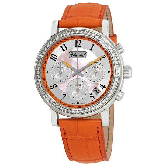 علبة من الفولاذ المقاوم للصدأ مع سوار برتقالي من جلد التمساح. إطار ثابت من الفولاذ المقاوم للصدأ مرصع بالألماس. ميناء برتقالي/عرق اللؤلؤ مع عقارب فضية اللون وعلامات ساعات بأرقام عربية. علامات دقائق حول الحافة الخارجية. نوع الميناء: تناظري. عرض التاريخ بين موضعي الساعة الرابعة والخامسة. كرونوغراف - ثلاثة أقراص فرعية تعرض: ٦٠ ثانية، ٣٠ دقيقة، و١٢ ساعة. حركة أوتوماتيكية مع احتياطي طاقة ٤٠ ساعة. زجاج ياقوت مقاوم للخدش. غطاء خلفي شفاف. شكل دائري. حجم العلبة: ٣٩ مم. مقاومة للماء حتى عمق ٣٠ مترًا / ١٠٠ قدم. الوظائف: التاريخ، الساعة، الدقيقة، الثانية. سلسلة ميل ميليا. تصميم ساعة فاخر. علامة الساعة: صناعة سويسرية. اختلافات المنتج: 178331 1420، 178331.1420، 1783311420. ساعة شوبارد ميل ميليا أوتوماتيكية مرصعة بالألماس للسيدات 178331-1420.