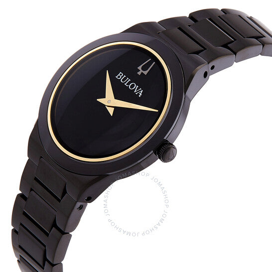 علبة وسوار من الفولاذ المقاوم للصدأ باللون الأسود. إطار ثابت من الفولاذ المقاوم للصدأ باللون الأسود. ميناء أسود بعقارب ذهبية اللون. نوع الميناء: تناظري. حركة أوتوماتيكية من بولوفا كاليبر 9T22. زجاج ياقوت مقاوم للخدش. غطاء خلفي صلب. شكل العلبة دائري، مقاسها: 32 مم، سمكها: 9 مم. إبزيم قابل للطي بزر ضغط. مقاومة للماء حتى عمق 30 مترًا / 100 قدم. الوظائف: الساعات، الدقائق. سلسلة ميلينيا. طراز الساعة الرياضية. ساعة بولوفا ميلينيا أوتوماتيكية نسائية بمينا أسود 98L314.