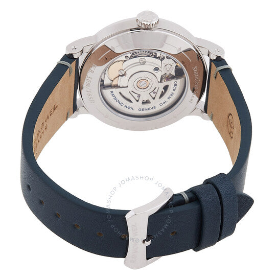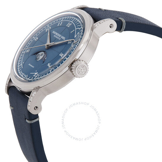 علبة من الفولاذ المقاوم للصدأ فضية اللون مرصعة بـ 16 ماسة مزروعة في المختبر. سوار من جلد العجل أزرق داكن. إطار ثابت من الفولاذ المقاوم للصدأ فضي اللون. ميناء أزرق من قماش الدنيم مع عقارب فضية اللون وعلامات ساعات بأرقام عربية. علامات دقائق حول الحافة الخارجية. نوع الميناء: تناظري. عقارب وعلامات مضيئة. ميناء فرعي واحد يعرض أطوار القمر. حركة أوتوماتيكية من ريموند ويل كاليبر RW4280، مبنية على SW200، تحتوي على 26 جوهرة، تنبض بمعدل 28800 ذبذبة في الساعة، ولديها احتياطي طاقة يدوم حوالي 38 ساعة. زجاج ياقوت مقاوم للخدش. غطاء خلفي شفاف. شكل دائري، حجم العلبة: 35 مم، سمكها: 9.98 مم. مشبك بإبزيم. مقاومة للماء حتى عمق 50 مترًا / 165 قدمًا. الوظائف: طور القمر، الساعة، الدقيقة، الثانية. سلسلة ميليسيم. تصميم كاجوال. علامة الساعة: صناعة سويسرية. ساعة ريموند ويل ميليزيم أوتوماتيكية بمرحلة القمر للسيدات 2145-SCS-05511.