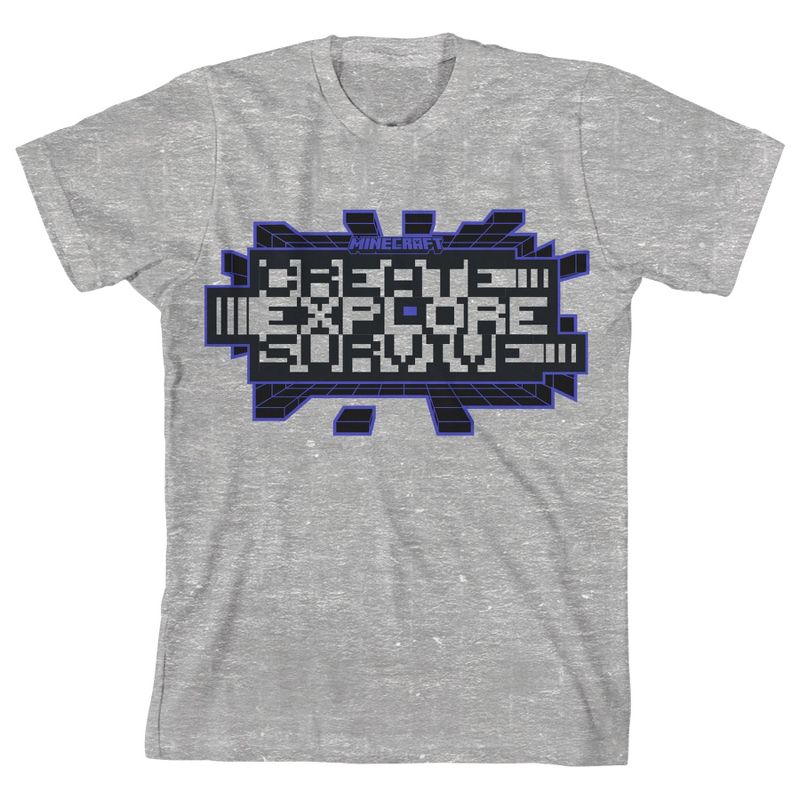 - تي شيرت رياضي رمادي بأكمام قصيرة - يتميز تي شيرت Minecraft Create, Explore, Survive Distortion Clash Trend Graphic Youth Boys بأكمام قصيرة تبدو مريحة في الطقس الدافئ.