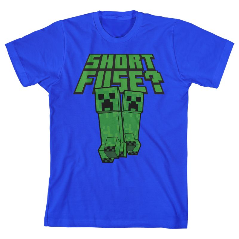 - تيشيرت برسومات جرافيكية: زوج من الزواحف يسيران تحت حروف خضراء كُتب عليها "فتيل قصير" في التصميم الجرافيكي لهذا التيشيرت. سيُعجب عشاق ألعاب الفيديو ماين كرافت الصغار بهذا التصميم الممتع.
