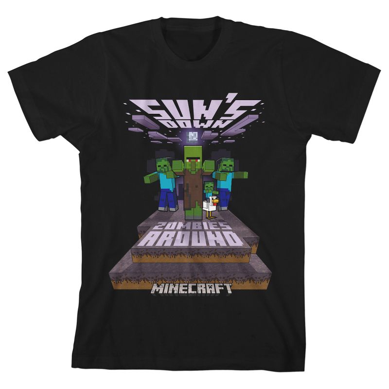 - تيشيرت برسومات جرافيكية: حشد من الزومبي يزحف عبر جرف تحت قمر مربع، بينما تُكتب عليه حروف بيضاء فوقهم وأسفلهم: "غربت الشمس، والزومبي حولنا". سيُعجب عشاق ألعاب ماين كرافت بتصميم هذا التيشيرت الجرافيكي.