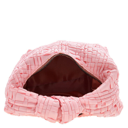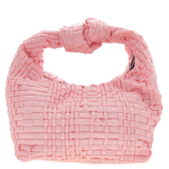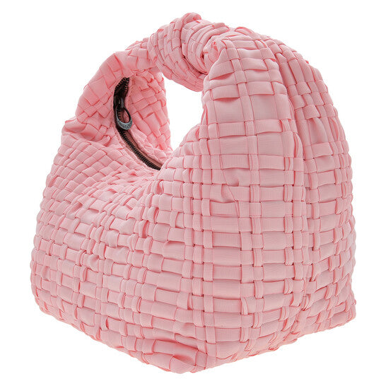 Maria La Rosa Ladies Mini Bag. SKU: SB23.11.2 MLR. Color: Ribbon Rosa Baby. Maria La Rosa Mini Datolite Bag. This compact top-handle bag is handwoven from ribbon fabric using antique looms, offering a fresh and vibrant style perfect for summer. Featuring a knotted sash handle and zip closure, it’s both playful and practical. Fully lined in cotton with an interior patch pocket. Handwoven on antique looms. Knotted top handle. Zip closure. 100% Polyester exterior. 100% Cotton lining with patch pocket. Dimensions: 7.9" L x 9.1" H x 5.9" W. Made in Italy.