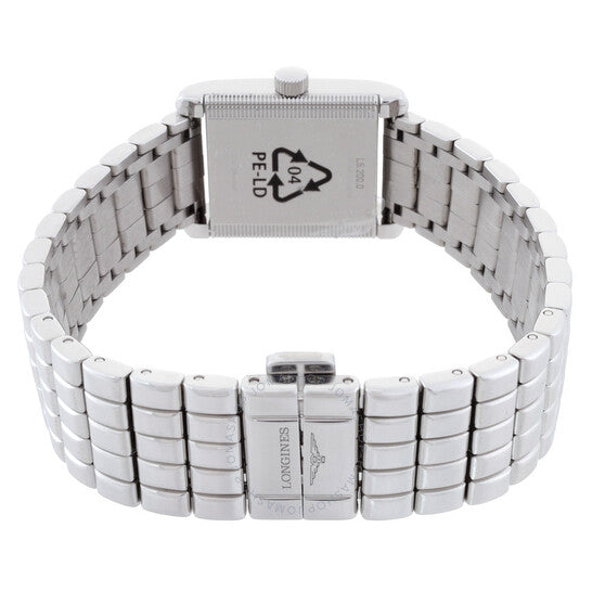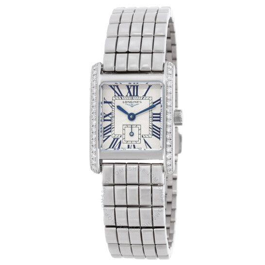 علبة وسوار من الفولاذ المقاوم للصدأ بلون فضي. إطار ثابت بلون فضي مرصع بالألماس. ميناء فضي "فلينك" بعقارب زرقاء وعلامات ساعات بأرقام رومانية. نوع الميناء: تناظري. ميناء فرعي واحد يعرض: ثواني صغيرة. حركة كوارتز لونجين كاليبر L178. زجاج ياقوت مقاوم للخدش. تاج قابل للسحب/الدفع. غطاء خلفي صلب. شكل العلبة مربع، أبعادها: 21.50 × 29.00 مم، سمكها: 6.75 مم. عرض السوار: 16 مم. مشبك قابل للطي مع مفتاح أمان. مقاومة للماء حتى عمق 30 مترًا / 100 قدم. الوظائف: الساعات، الدقائق، الثواني الصغيرة. معلومات إضافية: علبة مرصعة بـ 38 ماسة ويسلتون من الدرجة الأولى IF-VVS، بإجمالي وزن 0.456 قيراط. سلسلة ميني دولتشي فيتا. طراز ساعة رسمية. علامة الساعة: صناعة سويسرية. ساعة لونجين ميني دولتشي فيتا كوارتز مرصعة بالألماس للسيدات L5.200.0.71.6.