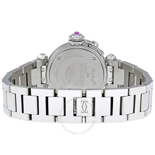 علبة مصقولة من الفولاذ المقاوم للصدأ مع سوار من الفولاذ المقاوم للصدأ. إطار ثابت من الفولاذ المقاوم للصدأ. ميناء مطلي باللون الوردي مع عقارب فضية اللون وعلامات ساعات شعاعية. أرقام عربية تُشير إلى الساعات 3 و6 و9 و12. آلية حركة كوارتز. كريستال ياقوت مقاوم للخدش. تاج لولبي بحجر كابوشون صناعي وردي. غطاء خلفي صلب. قطر العلبة: 27 مم. سُمكها: 8 مم. مقاومة للماء حتى عمق 30 مترًا (100 قدم). الوظائف: الساعات، الدقائق. ساعة كارتييه ميس باشا من الفولاذ المقاوم للصدأ W3140023.