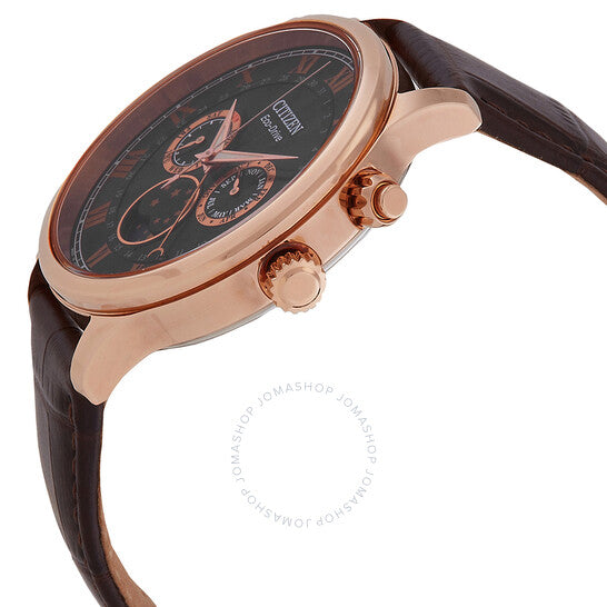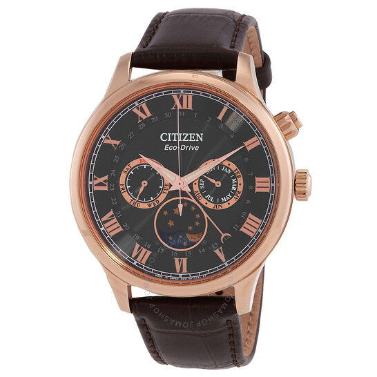 علبة من الفولاذ المقاوم للصدأ بلون الذهب الوردي مع حزام جلدي بني. إطار ثابت من الفولاذ المقاوم للصدأ بلون الذهب الوردي. ميناء أسود بعقارب بلون الذهب الوردي وعلامات ساعات بأرقام رومانية. علامات دقائق حول الحافة الخارجية. نوع الميناء: تناظري. مؤشر للتاريخ. ثلاثة أقراص فرعية لعرض: اليوم، الشهر، ومرحلة القمر. حركة سيتيزن كاليبر 8651 إيكو-درايف. زجاج من الياقوت المقاوم للخدش. تاج قابل للسحب/الدفع. غطاء خلفي صلب. شكل دائري، مقاس العلبة: 42.2 مم، سمكها: 10.1 مم. مشبك بإبزيم. مقاومة للماء حتى عمق 50 مترًا / 165 قدمًا. الوظائف: التاريخ، اليوم، الشهر، الساعة، الدقيقة، الثانية، ومرحلة القمر. طراز الساعة الرياضية. ملصق الساعة: Japan Movt. ساعة سيتيزن مون فيز إيكو-درايف للرجال بمينا سوداء، AP1059-19E.